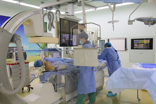 合——介入-外科杂交手术。介入复合手术部利用先进的设备如飞利浦双C臂血管造影引导下完成介入外科杂交手术,如巨型假性动脉瘤、颈内动脉闭塞等。