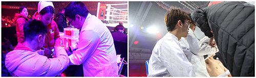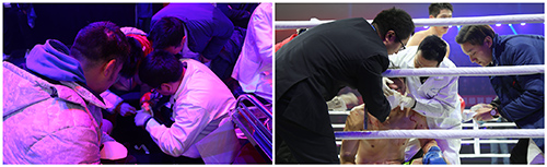 30日总决赛,第一场60公斤级别比赛,一名选手因29日半决赛中双腿多处挫伤、肿胀,疼痛不已,不忍心因此放弃决赛,赛前求助,蓝十字医务人员现场及时为其进行了止痛处理,帮助他完成了比赛。比赛一结束,便将他由救护车紧急送院,通过急诊绿色通道作进一步检查治疗。