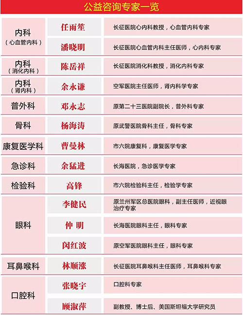 参加本次公益活动的专家中,既有久负盛名的医疗名家,又有博学精进的专科精英。这些远近闻名的医界的专业所长覆盖了内科(心血管内科、消化内科、肾内科)、普外科、骨科、康复医学科、急诊科、检验科、眼科、耳鼻喉科、口腔科等领域。