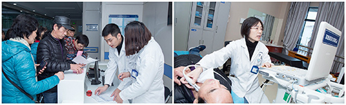 超声科医务人员在科主任李卫萍的带领下早早做好准备,为听完讲座的居民进行颈动脉斑块检查。