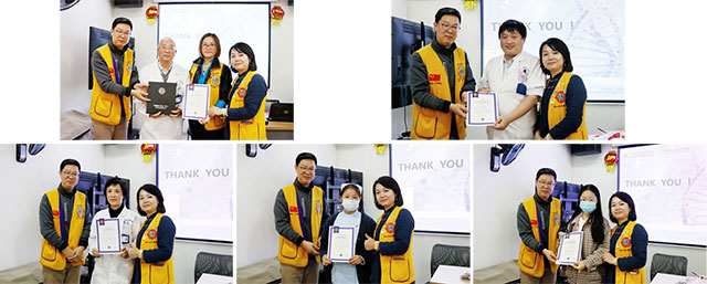 ▲ 中国狮子联会浙江代表处糖尿病预防项目委员会负责人颁发纪念品及志愿服务证书