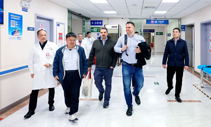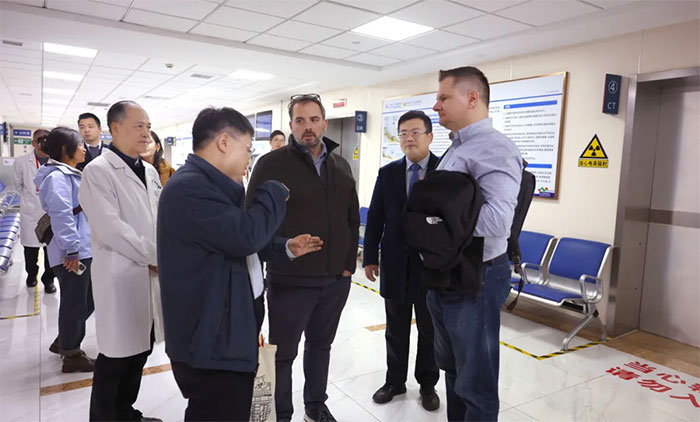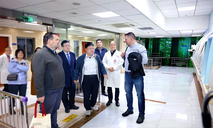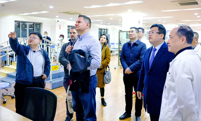 Dean Krusienski博士、Gerwin Schalk博士、金晶教授一行抵达医院后,在朱敏书记、项耀钧院长等的陪同下,实地参观考察了医院康复医学科、高压氧科、医学影像科等重点特色科室,并与科室主任及医护人员进行了互动交流。