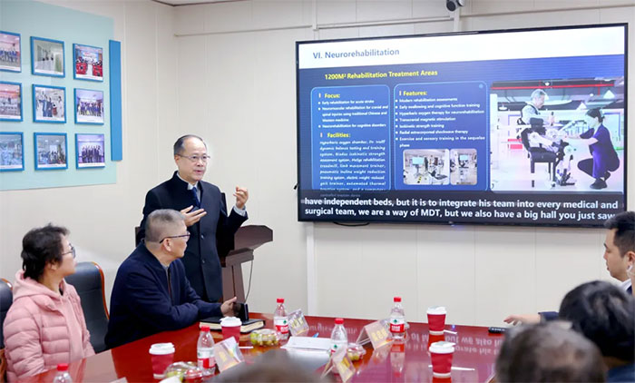 座谈交流环节,项耀钧院长从发展历程、学科建设、优势技术、设施设备、愿景规划、国际交流与合作等方面介绍了医院情况。项院长指出,医院致力于不断探索脑科学先进技术的研究和临床应用,于2021年与华东理工大学建立合作,成为其脑机接口技术临床应用基地。双方在推动脑机接口技术于意识障碍患者评估应用方面取得了可喜的临床效果,成功促醒多名慢性意识障碍昏迷患者。