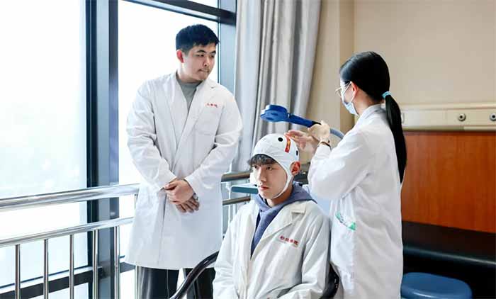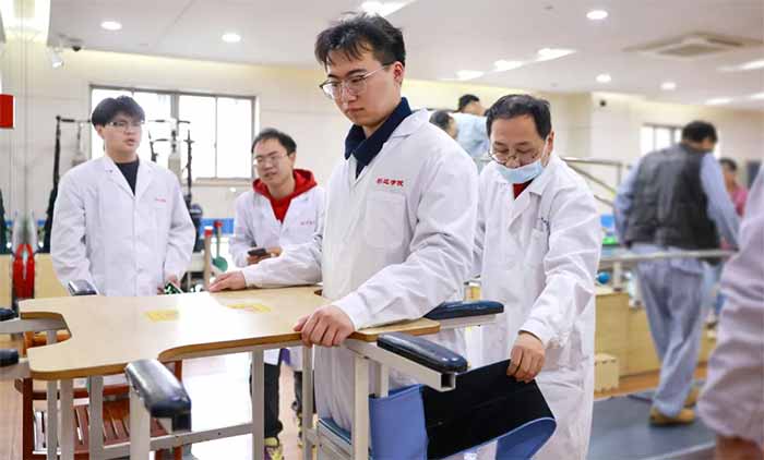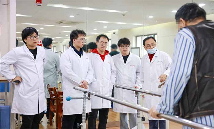 在医院1200平方米的多功能康复大厅,部分患者正在治疗师的指导下进行康复训练。沈志祥博士向学生们介绍,医院以神经专科为特色,神经康复主要围绕神经系统疾病或损伤导致的功能障碍,通过综合、规范、个体化的康复手段,促进神经功能重塑,改善运动、感觉、认知、言语、吞咽及日常生活能力,帮助患者最大程度恢复社会参与能力。他强调,神经康复不是辅助治疗,而是神经系统疾病整体治疗中不可或缺的重要部分。