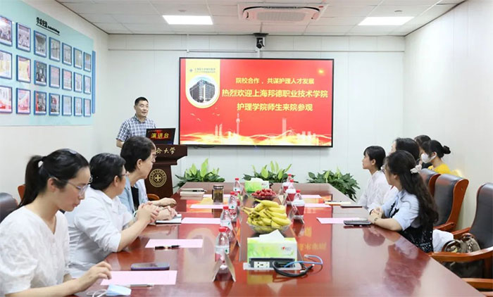 6月30日下午,上海邦德职业技术学院护理学院院长陈宁率领学院辅导员李凡、老师孙慧君及首届脑科班学生等一行莅临上海蓝十字脑科医院参观交流。上海蓝生脑科医院投资股份有限公司医疗管理部护理培训主任唐秀花,医院院长项耀钧、护理部主任张秀娟、护士长陈婷婷等接待陪同。副院长潘耀良主持座谈会。