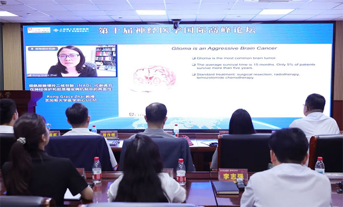 Rong Grace Zhai教授作“烟酰胺腺嘌呤二核苷酸(NAD)代谢调节在神经保护和胶质瘤发病机制中的两面性”学术报告。她重点围绕NAD与肿瘤发生的相关性、NAD代谢对肿瘤细胞的影响等方面进行了精彩讲解,其研究团队正在开发针对NMNAT1抑制剂以降低其在胶质瘤中的表达,同时提高NMNAT2在神经元中的表达,以抑制胶质瘤的发生并增强神经保护功能,为胶质瘤治疗带来新希望。