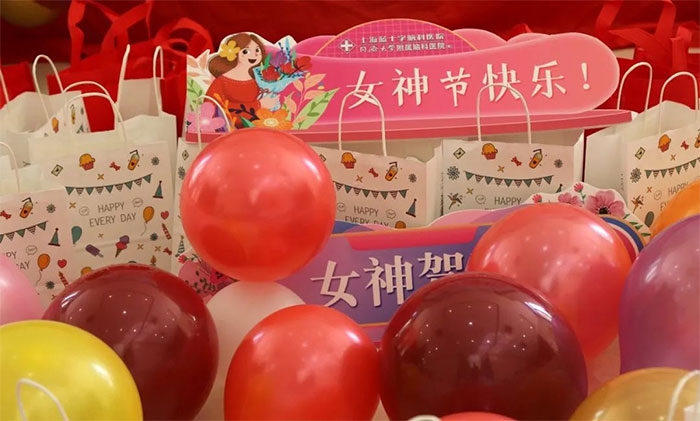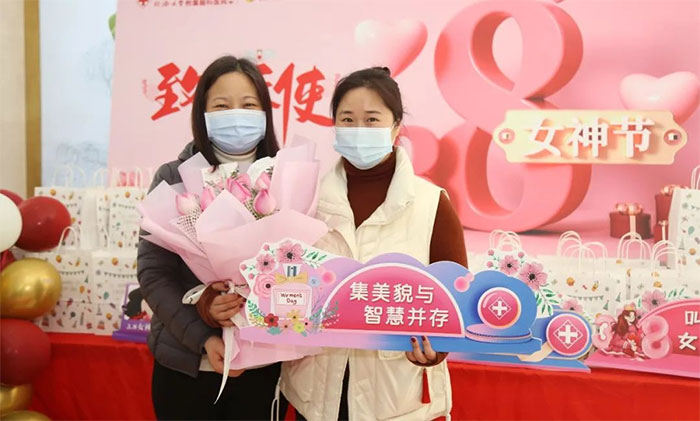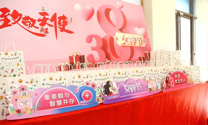 门诊大厅布置一新,“3.8女神节——致敬最美天使”的粉色画板默默宣示着——今天是特别的一天。“心”形的礼品堆头、缤纷的五彩气球和如花的灿烂笑靥交相辉映,编织成了这个春天最美的场景。
