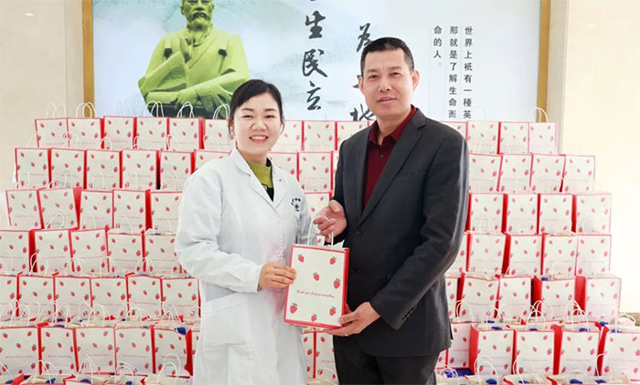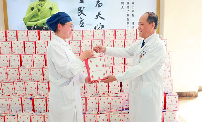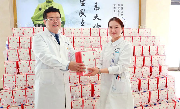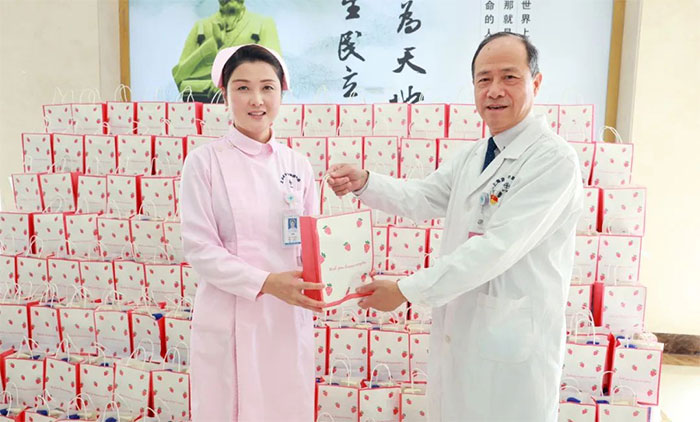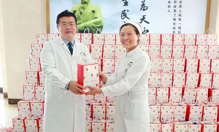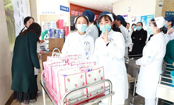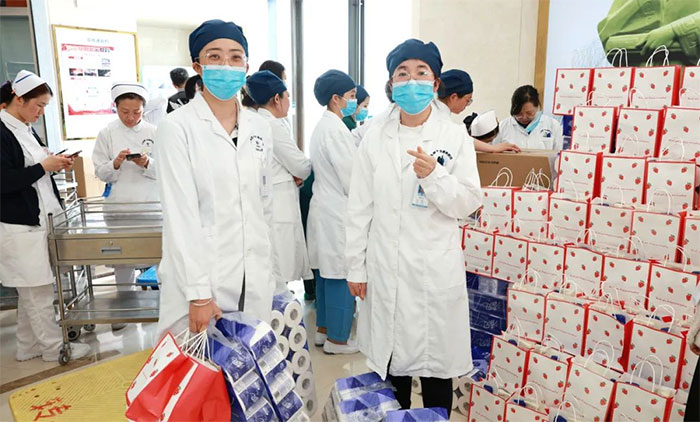 女员工们收到礼物后,脸上洋溢着幸福的笑容,为医院送上的节日关爱而倍感温暖。她们互相分享着喜悦,传递着祝福。