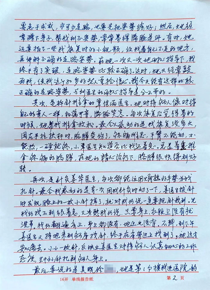 而正如韩老伯在感谢信中所描述的,从科室主任周君到管床医生、从护士长武玉燕到值班护士、从康复治疗师到杵针(医生)……韩老伯在住院期间,不仅切身体会到了医护各环节的专业和敬业,还额外体会到了如同亲人般的关爱和温暖。