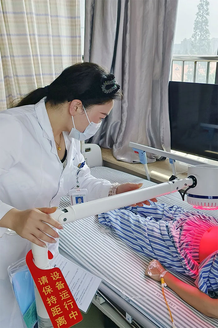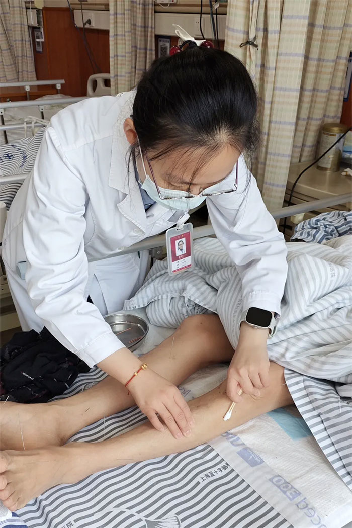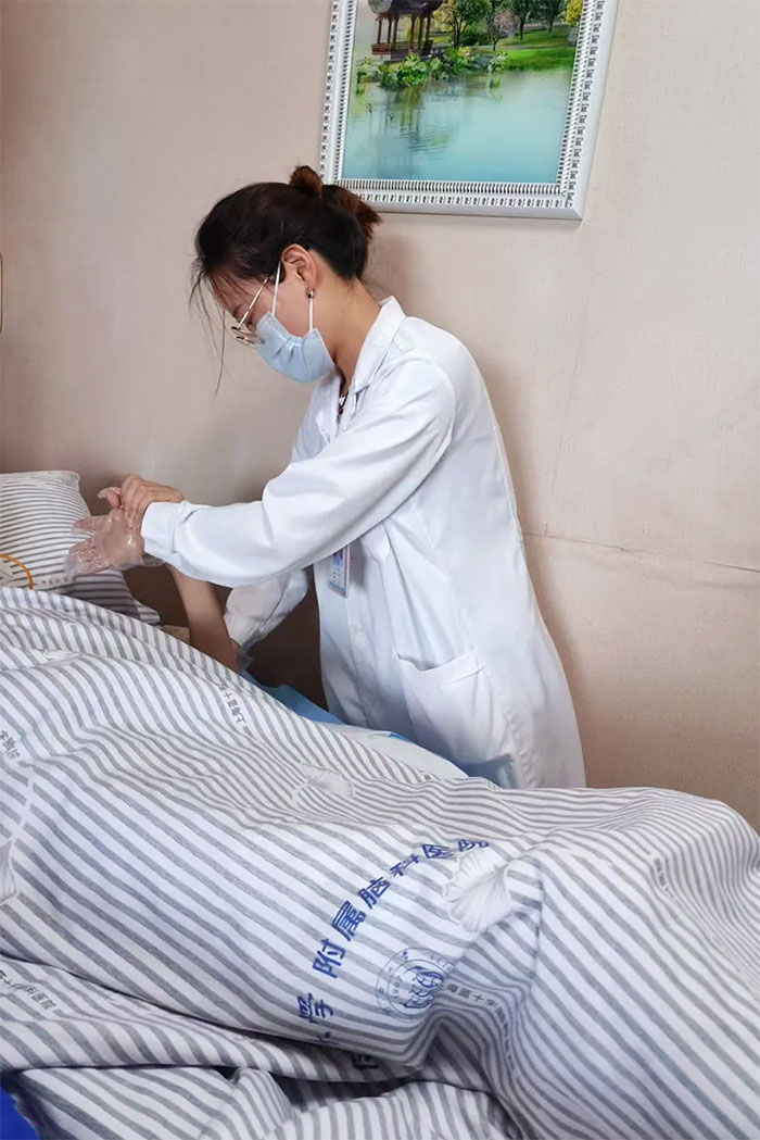 治疗室、病床旁,推拿、针灸、红外线治疗......假期里,依然随处可见中医师忙碌的身影。赵宇兰副主任及医师王伟、罗思思等悉心为患者实施各种中医治疗。他们时而附身询问患者感受,时而调整针/仪器的角度或者推拿的力度,专注的神情仿佛在雕琢一件艺术品。“看到患者眉头舒展,说症状有好转,再苦再累都值了。”