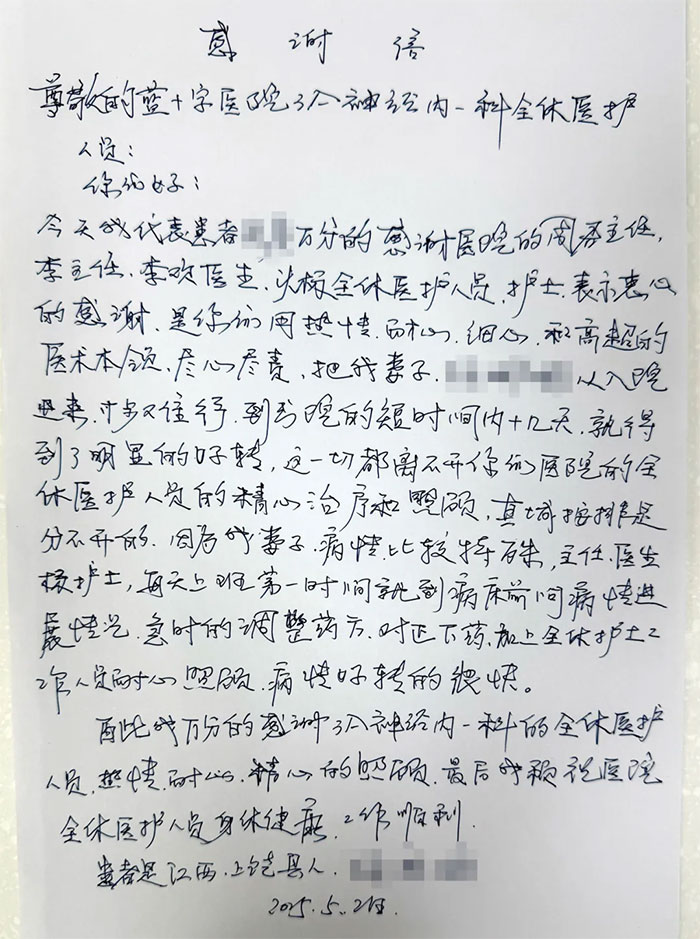 “祝你生日快乐,祝你生日快乐......”5月2日,5B神经内二科病房温馨而又热闹。当天是患者邬阿婆的百岁生辰。李振东主任、余志良副主任、黄朵朵护士长等精心布置病房,带领科室医护人员同唱生日歌,送上祝福与鲜花,为阿婆庆祝生日。阿婆脸上洋溢着幸福笑容,家属也对医护团队的悉心照料表达了由衷感谢。“有时去治愈,常常去帮助,总是去安慰”,在蓝十字,这样的医患温情故事经常上演。他们以爱为底色,将节日的温暖守护与陪伴传递,使医疗更有情怀,人文更有价值。