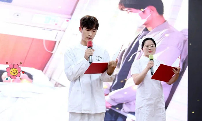 随后,蓝十字护理同仁用精心准备的诗朗诵《爱 生命 信仰》、演讲《会说话的扇子》等节目来庆祝国际护士节。诗朗诵《爱 生命 信仰》,歌颂了蓝十字护理工作者守护生命、无私奉献的大爱精神,如神经内科7A病区护士长李楠楠连续多年舍小家为大家,过年放弃与家人团聚,守护在患者身边;神经内科3B病区赵中丽护士,主动放弃休息,陪伴守护在焦躁不安的术后患者身边,轻声安慰患者……一幅幅动人的画面,让人潸然泪下。演讲《会说话的扇子》聚焦蓝十字护理工作者日常工作中的点滴细节,如何想方设法与失语患者沟通,提高优质服务水平,让人动容。