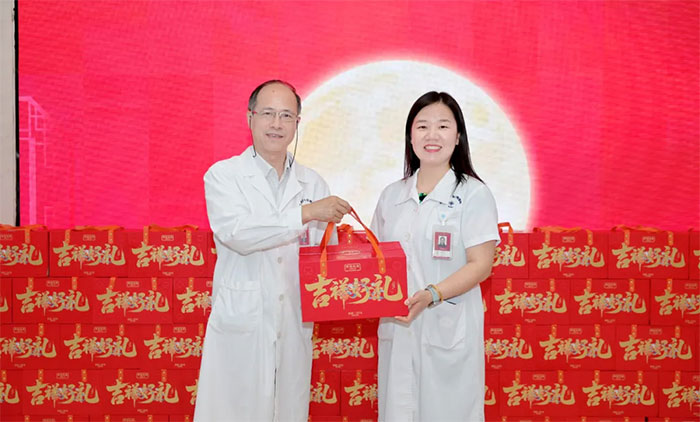 书记朱敏和院长项耀钧等院领导心系职工,来到门诊大厅与大家亲切交谈,逐一将象征着“团圆美满”的月饼礼盒送到各科室员工代表手中,致以节日的诚挚问候。每一份礼盒都满载着医院的深切关怀与诚挚祝福,让大家感受到了节日的喜悦,更体会到了“蓝十字”大家庭的温暖。