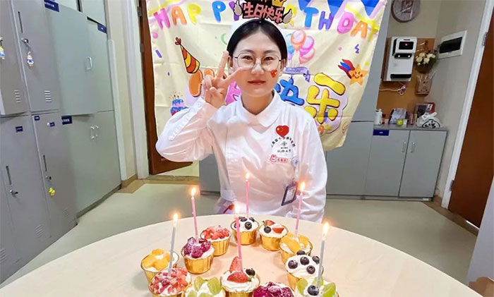 “十一”国庆节当天,1年资新护士孔祝庆更是在岗位上、在忙碌中度过了一个难忘的生日。