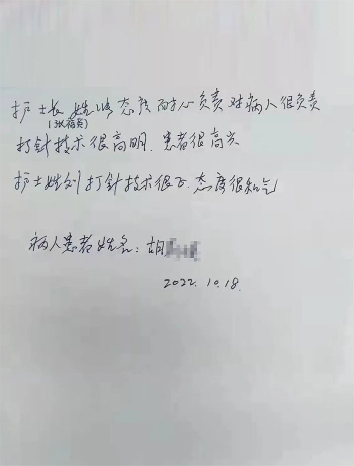 “我们是输液室的(患者),你们输液室的护士服务态度真好,水平又高,我们感到很暖心(温心)......”