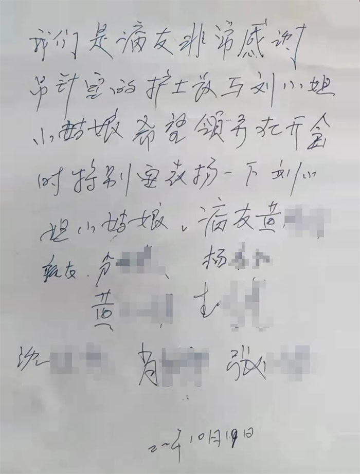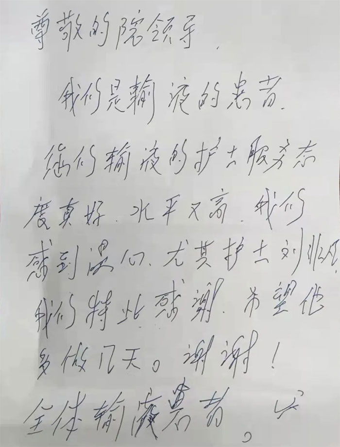 “我们是病友,非常感谢吊针室的张小姐和刘小姐小姑娘,希望领导在开会时特别要表扬一下......”