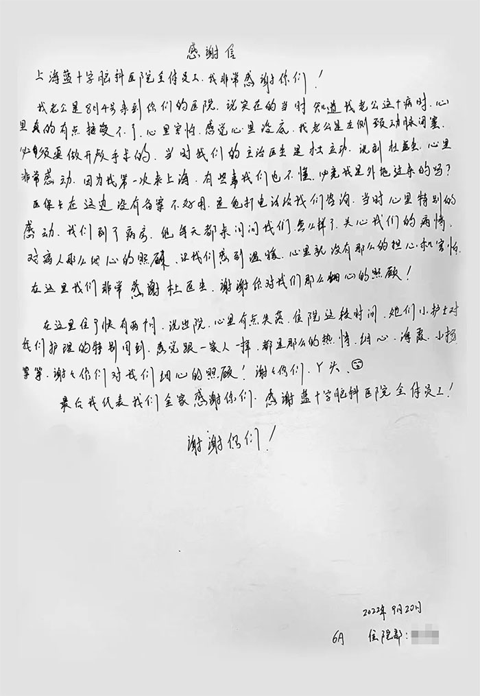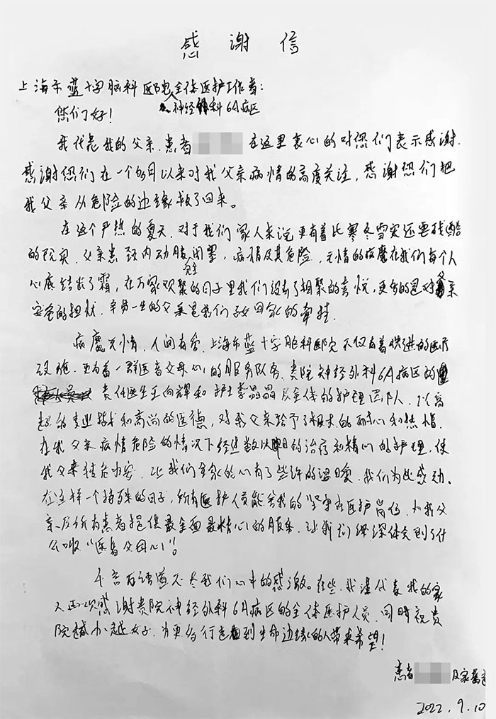 最后,我代表我们全家感谢你们,感谢蓝十字脑科医院全体员工!