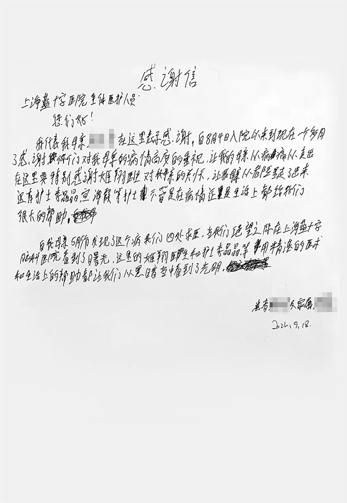 在这里要特别感谢姬翔医生对我母亲的关怀,让我母亲从危险里走了出来。还有护士(长)李晶晶、宣海霞等护士,不管是在病情(护理)还是生活上都给我们很大的帮助。