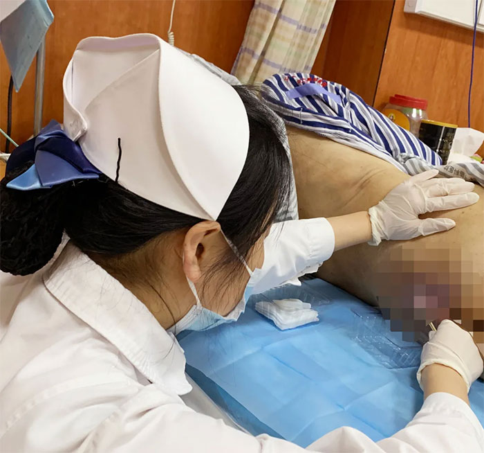 因为患者年事已高,压疮又严重,在护士长带领下,护理团队张静花、黄燕等每天为患者冲洗处理压疮,刚开始患者感染比较严重,恶臭味也很大,但她们处理得却异常认真仔细。从清洗,到一层层敷上不同的药膏,这可不是一件轻松的活,经常忙得一头大汗,无暇擦拭。同时责任护士和护工每天间隔两小时为患者翻身一次,以免压疮加重。