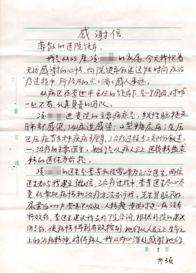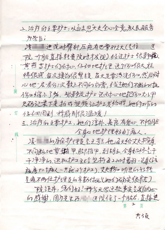 我是4A48床凌xx的家属,今天我怀着无比感谢的心情,向院领导叙述这段时间在治疗过程中所经历的点点滴滴感人事迹。
