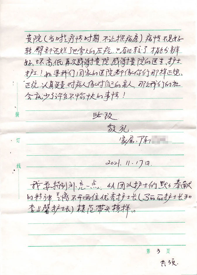 院领导:您们好!我今天写这些事实是发自内心的感谢,因为先生在xx医院住了一个月左右,直接进贵院(当时是疫情时期,不让探病房),病情不见好转,臀部还烂了巴掌大的压疮,只有比较了才能分辨好坏高低,再次感谢贵院的医生、护士、护工!如果我们国家的医院都像你们那样正规正统,认真负责,对病人像自己亲人,那么我们的社会就少了许多不愉快的事情!