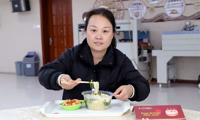 10F综合内科主任许培培吃着鲜美爽滑又暖呼呼的长寿面,大快朵颐,表示自己从医20多年,从来没有在单位过过集体生日会,这是她入职蓝十字以来过的第二个集体生日会,直言特别感动、暖心。“医院施行‘员工满意工程’,是真正的为员工办实事,我对医院很满意。”
