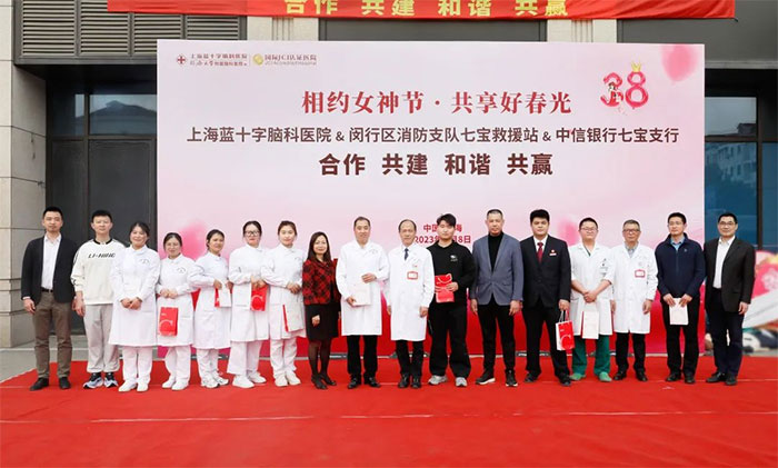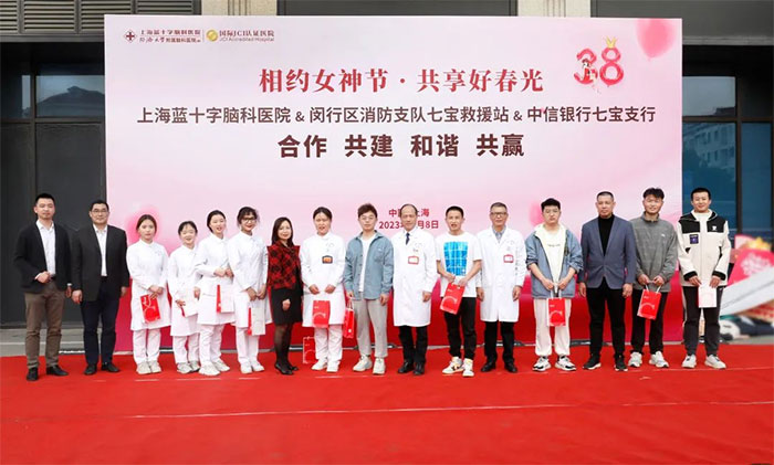 天初暖,日初长,好春光!为庆祝第113个“三八”国际妇女节,3月8日下午,上海蓝十字脑科医院联合党建共建单位闵行区消防支队七宝救援站、睦邻单位中信银行七宝支行开展了“相约女神节 共享好春光”联谊活动。闵行区消防支队七宝救援站代表,中信银行七宝支行行长李德英,医院院长项耀钧、副总经理兼工会主席吴春芳等领导出席活动,三家单位职工及党员代表共计60余人参加活动。