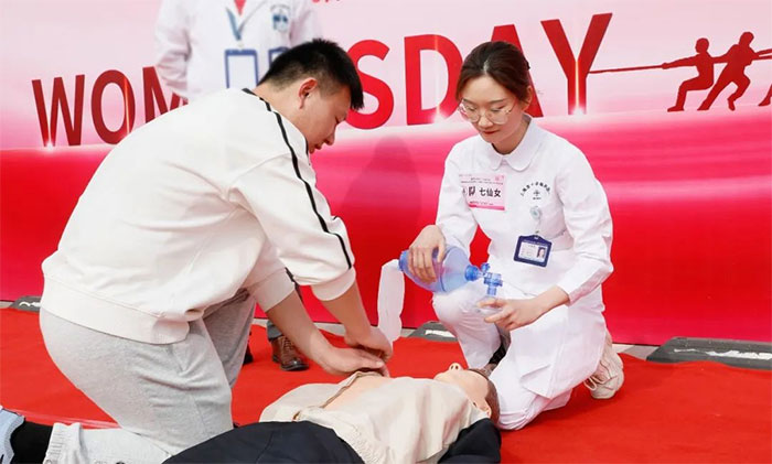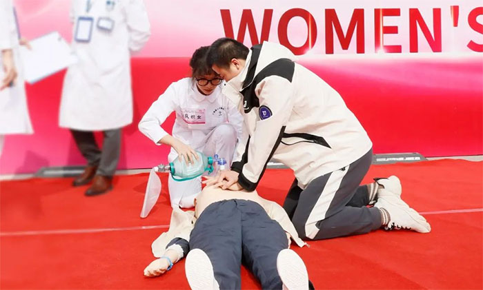 “双人心肺复苏技能比拼”采取裁判评分制,每队各推选男女队员一名参与,得分前两位的两组将胜出。比赛开始,各组快速进入模拟急救状态。判断意识、启动急救反应程序、摆放体位、胸外心脏按压、开放气道、人工呼吸......各组男女队员认真操作,默契配合,展示了严谨娴熟的急救技能。经过激烈比拼,最终牛郎织女队和董永七仙女队获得优胜。