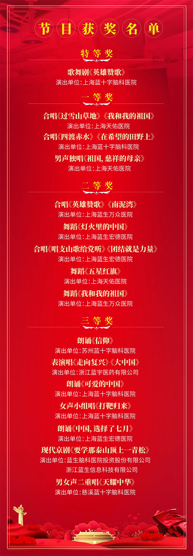 本次文艺汇演是公司党史学习教育的重要形式,旨在通过喜闻乐见的优秀文艺作品,讲述党史故事,传播党的声音,汲取奋进力量,让“党史之光”焕发“文艺之美”,为党史学习教育增添活力。整台演出主题鲜明,气势恢弘,高潮迭起。在2个多小时的演出中,以歌传情、以舞颂恩,大力唱响共产党好、社会主义好、改革开放好、伟大祖国好的时代主旋律,全方位呈现了蓝生脑科人戮力同心、攻坚克难、积极进取、蓬勃向上的奋斗姿态,展现了蓝生脑科人为助力健康中国战略、实现蓝生“十四五”发展目标执着奋进的精神风貌。