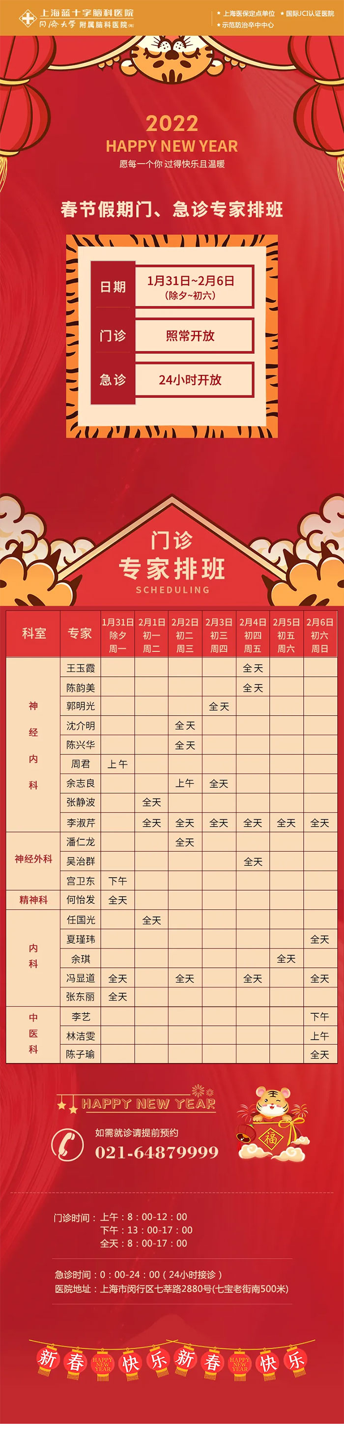 2022年春节长假将至,上海蓝十字脑科医院预祝广大市民朋友们过一个欢乐祥和的中国年。