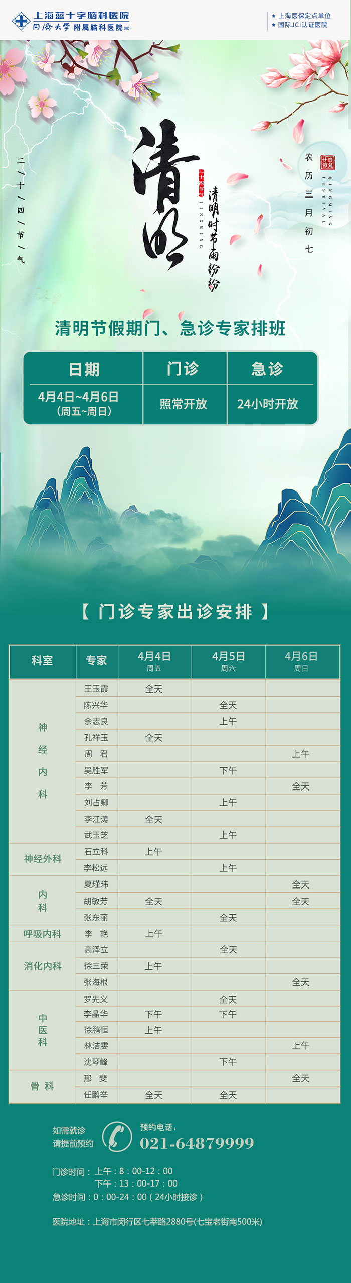 为方便广大市民朋友就诊,我院于清明节放假期间:4月4日(周五)-4月6日(周日)门、急诊照常开放。具体排班公告如下: