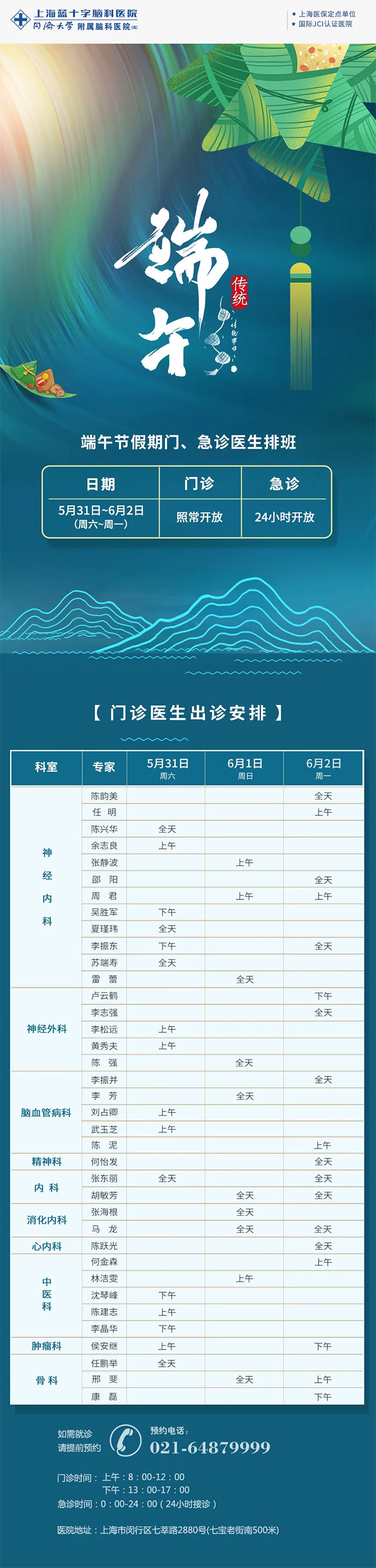 为更好满足广大市民朋友的就医需求,根据国务院有关法定假日安排的规定,结合上海蓝十字脑科医院【同济大学附属蓝十字脑科医院(筹)】实际情况,2025年端午节假期5月31日—6月2日(周六至周一)期间医院门、急诊照常开诊。具体排班公告如下: