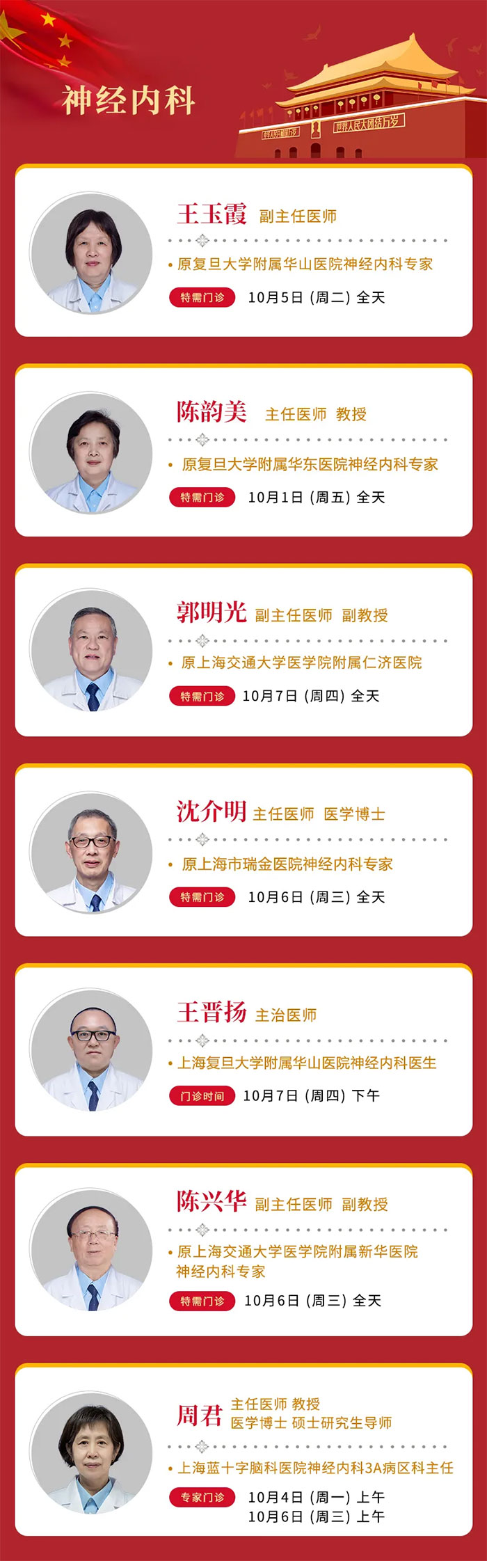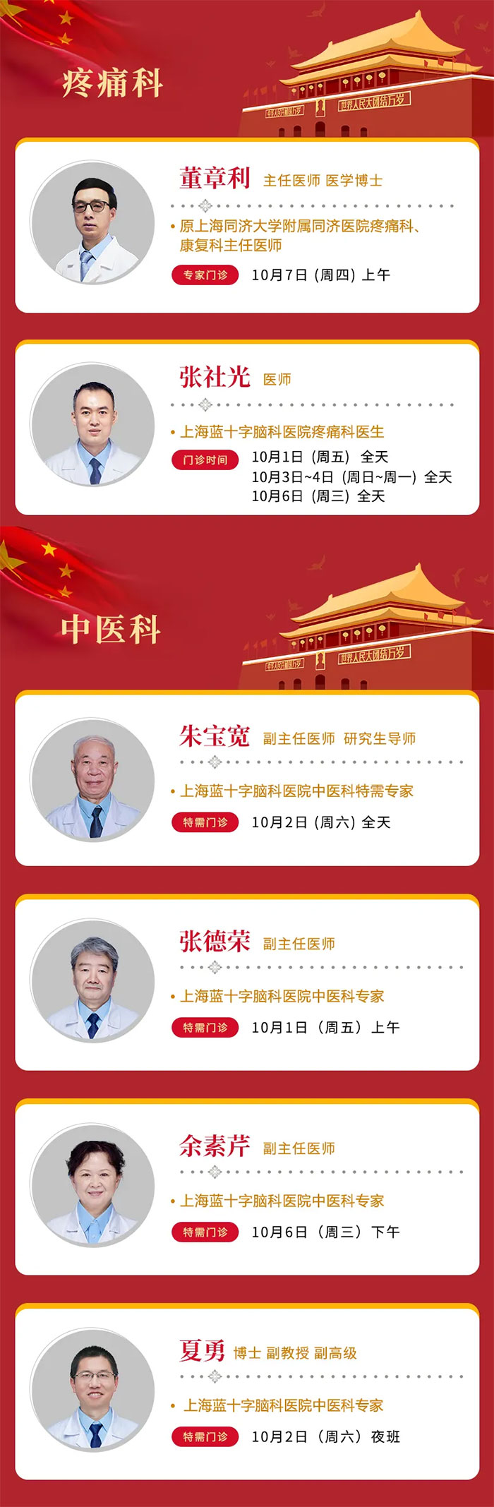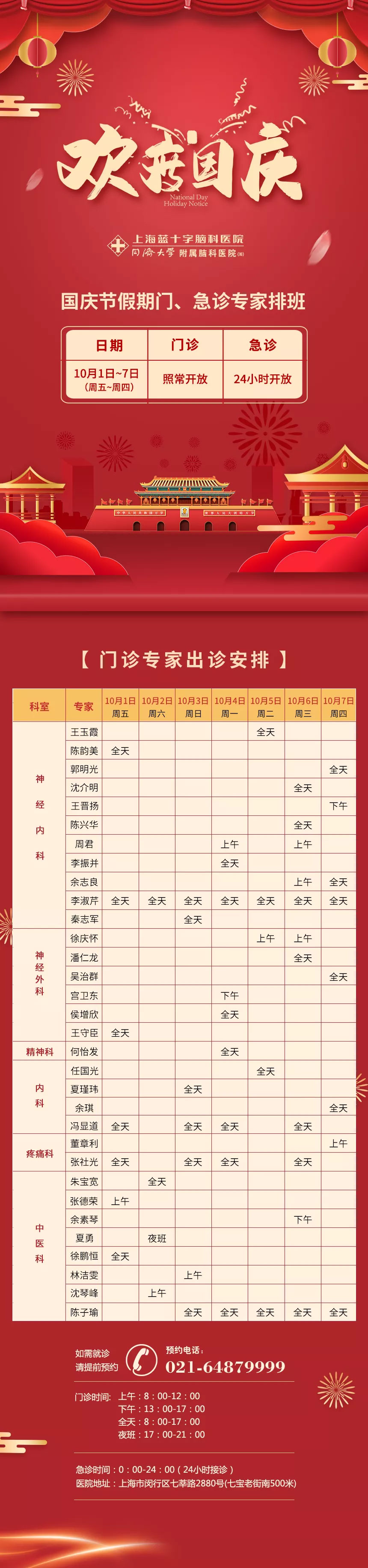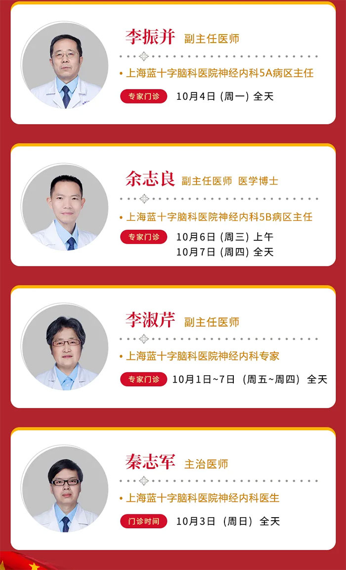 因假期就诊人数较多,建议您关注上海蓝十字脑科医院微信公众号或拨打预约电话(021-64879999)提前预约,以减少您的排队等候时间。庆国庆,大家齐欢乐,五十六个民族共欢腾,祝我们的祖国欣欣向荣!