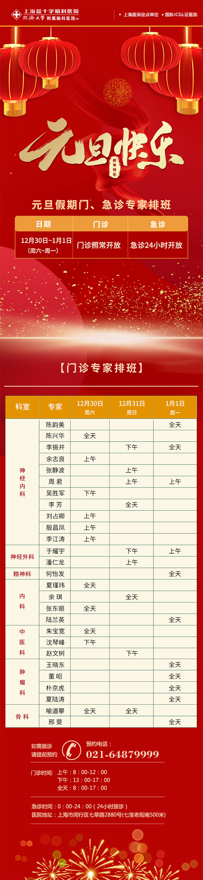 最后,上海蓝十字脑科医院全体医护人员恭祝广大市民朋友们——元旦快乐,阖家欢乐,幸福安康!