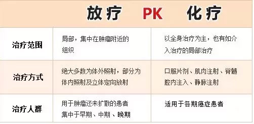 放疗是治疗肿瘤的主要手段之一,是用射线对肿瘤部位进行直接照射从而杀死肿瘤细胞达到治疗肿瘤的目的,化疗是用药物杀死肿瘤细胞控制肿瘤,放疗是物理的方法,化疗是化学的方法;放疗是局部治疗,化疗是全身治疗,根据患者实际情况有时需要两者结合起来以增加肿瘤的控制率和治疗率。