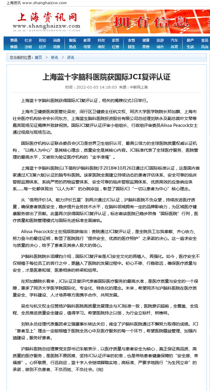 上海蓝十字脑科医院获得国际JCI复评认证,相关的揭牌仪式3日举行。
