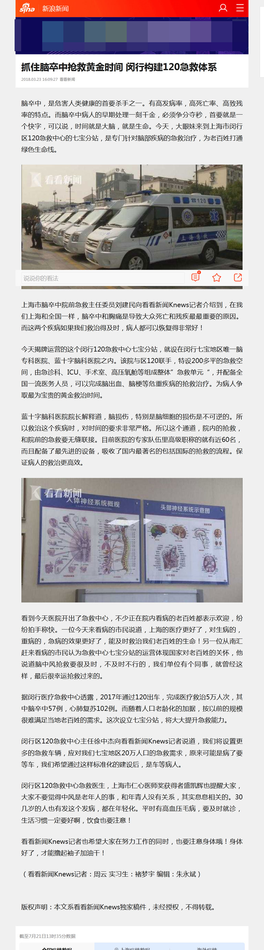 上海市脑卒中院前急救主任委员刘建民向看看新闻Knews记者介绍到,在我们上海和全国一样,脑卒中和胸痛是导致大众死亡和残疾最最重要的原因。而这两个疾病如果我们救治得及时,病人都可以恢复得非常好!