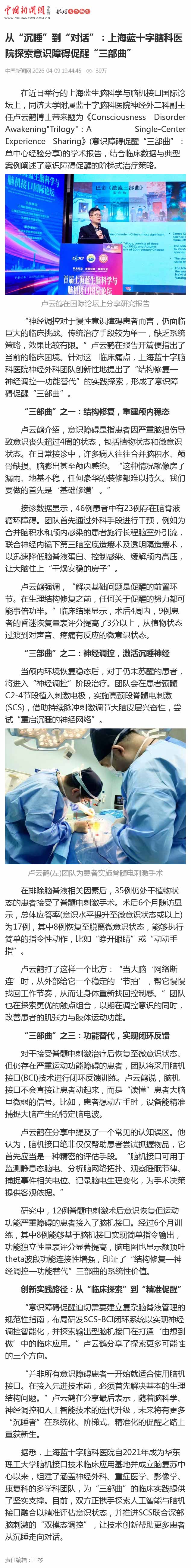 据悉,上海蓝十字脑科医院自2021年成为华东理工大学脑机接口技术临床应用基地并成立脑复苏中心以来,组建了涵盖神经外科、重症医学、影像学、康复科的多学科团队,为“三部曲”的临床实践提供了坚实支撑。目前,双方正携手探索人工智能与脑机接口融合以精准评估意识状态,并推进SCS联合深部脑刺激的“双模态调控”,让技术创新帮助更多患者从沉睡走向对话。