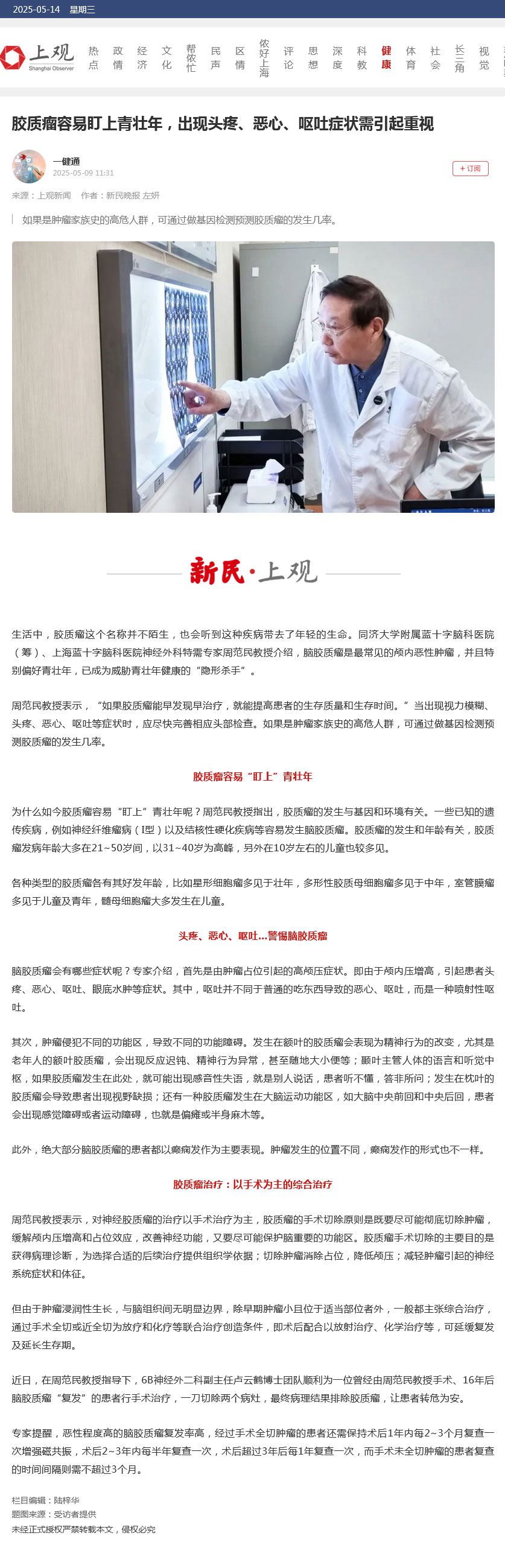 生活中,胶质瘤这个名称并不陌生,也会听到这种疾病带去了年轻的生命。同济大学附属蓝十字脑科医院(筹)、上海蓝十字脑科医院神经外科特需专家周范民教授介绍,脑胶质瘤是最常见的颅内恶性肿瘤,并且特别偏好青壮年,已成为威胁青壮年健康的“隐形杀手”。