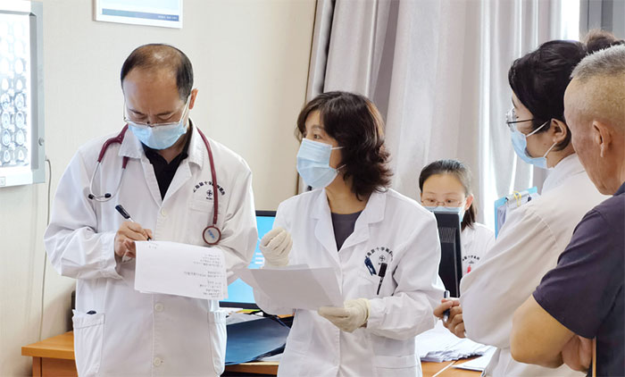 张静波主任(中)与病区医生分析病情