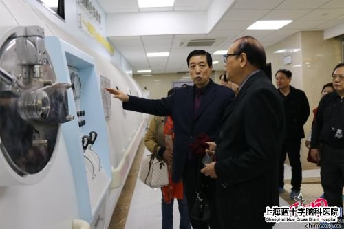 袁士宗副院长给高明见教授介绍高压氧仓群,他说:“这是采用国内先进的高压氧仓群。”