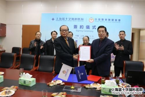 台湾医事联盟协会理事长高明见(左)与上海蓝十字脑科医院新院副院长袁士宗(右)递交战略合作协议