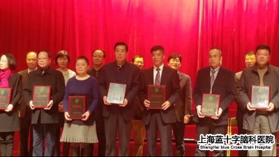 上海蓝十字脑科医院新院副院长袁士宗教授(前排左四)上台接受奖牌