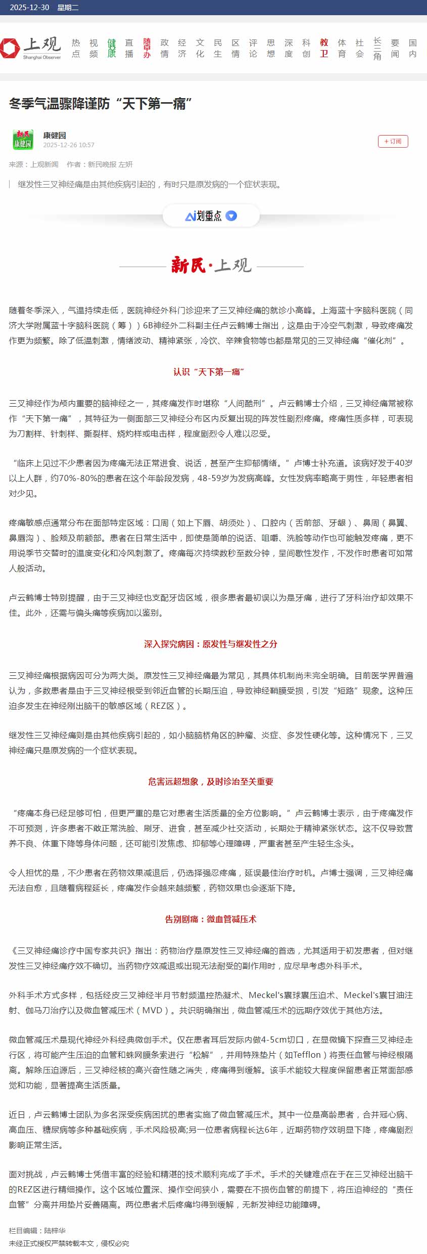 随着冬季深入,气温持续走低,医院神经外科门诊迎来了三叉神经痛的就诊小高峰。上海蓝十字脑科医院(同济大学附属蓝十字脑科医院(筹))6B神经外二科副主任卢云鹤博士指出,这是由于冷空气刺激,导致疼痛发作更为频繁。除了低温刺激,情绪波动、精神紧张,冷饮、辛辣食物等也都是常见的三叉神经痛“催化剂”。
