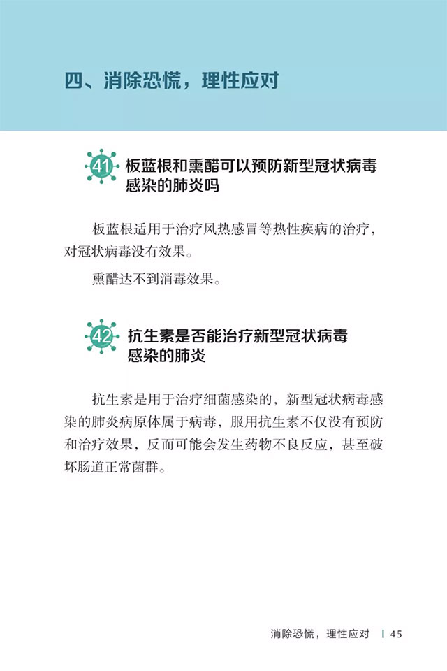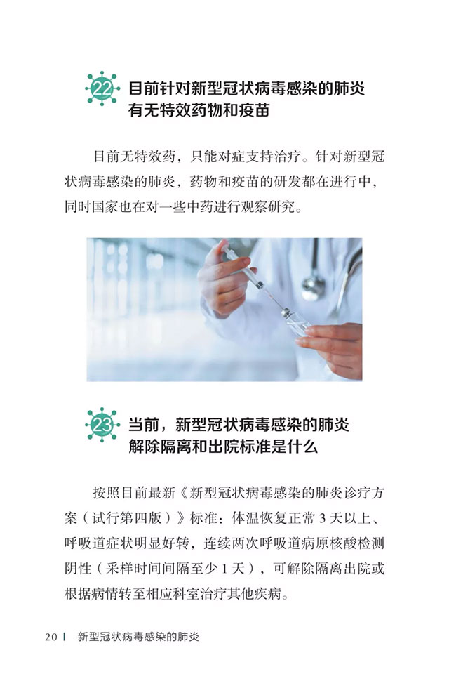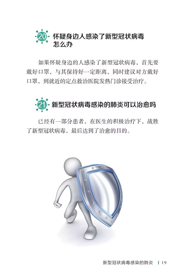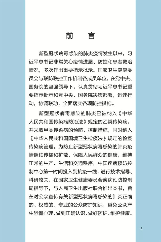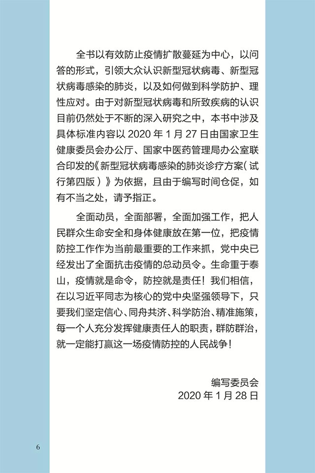 此书聚焦公众个人与家庭防护、居家医学观察、理性就医、心理疏导等防治细节,通过问答形式解读新型冠状病毒感染的肺炎有关问题疑惑,引导公众正确认识,积极做到防治结合、科学防护、消除恐慌、理性应对。此书包括图书、电子书、网络版读物等多种形式,第一批图书已紧急送往武汉抗击疫情第一线,电子书、网络版读物在学习强国、健康中国、人卫健康、掌阅等多个网络平台、微信公众号公益传播,并为全国各地提供可印制的PDF版本。