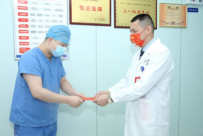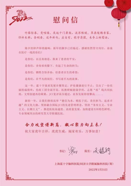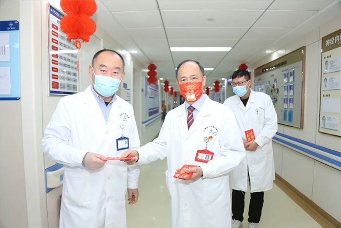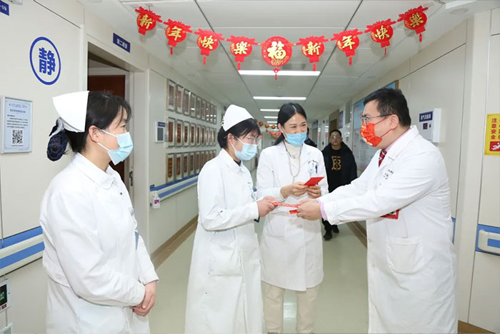 为生命开路者,不可使其困顿于荆棘。1月31日下午五时,总经理兼党支部书记朱敏、院长项耀钧携吴春芳、周克祥、郭荣峰等院领导,深入各科室,亲切慰问值守人员,送上新年红包、慰问信和美味盒饭。院领导的关怀如春风化雨,滋润心田,让所有人如沐春风,倍感温暖。