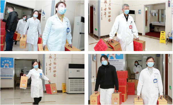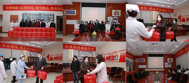 ▲ 朱敏书记、项耀钧院长向员工送上新春大礼包