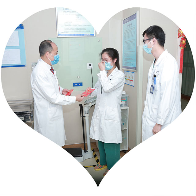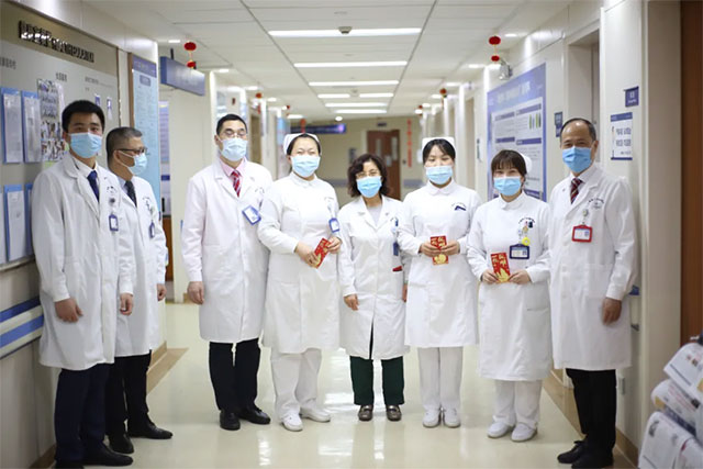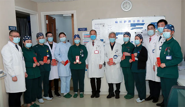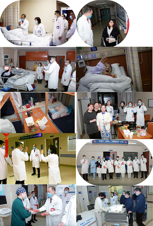 傍晚时分,上海蓝十字脑科医院项耀钧院长、潘耀良副院长、周克祥副院长,吴启航副总等领导一起,向春节值班的医生和护士们拜年,向他们表示节日的问候和衷心的祝福,项院长代表医院为值守大年夜的医护人员及后勤人员送上医院的慰问红包;潘仁龙主任已连续多年值守。同时,项院长还慰问了留院病患,并向他们拜年,让病患非常感动,有位85岁的脑梗病患激动得回礼道:“也祝你们新年快乐,身体健康!”