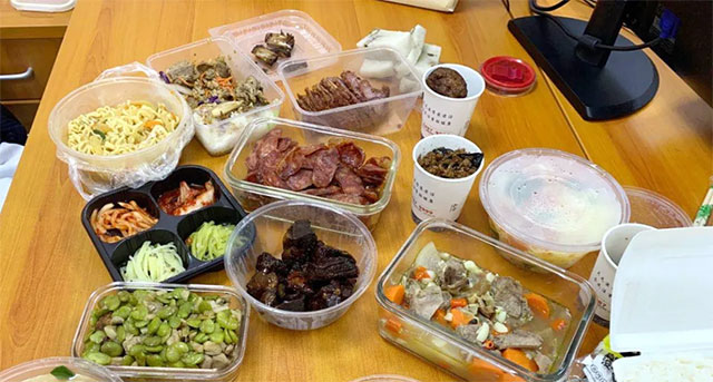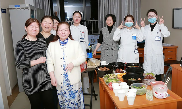 ▲ 门诊部别样“团圆饭”——患者家属送的、自己做的、同事家人做的