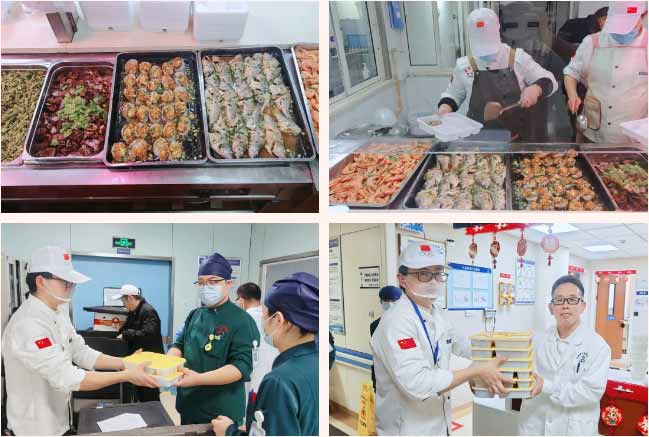 医院后勤食堂的师傅们,同样没有回家。灶火燃起,锅铲翻飞,一份份热腾腾的年夜饭打包送出,被送往急诊与病区,送到了每一个无法回家吃年夜饭的蓝十字人手中。没有山珍海味,却盛满了医院深切的牵挂、无言的关爱和美好的祝愿。